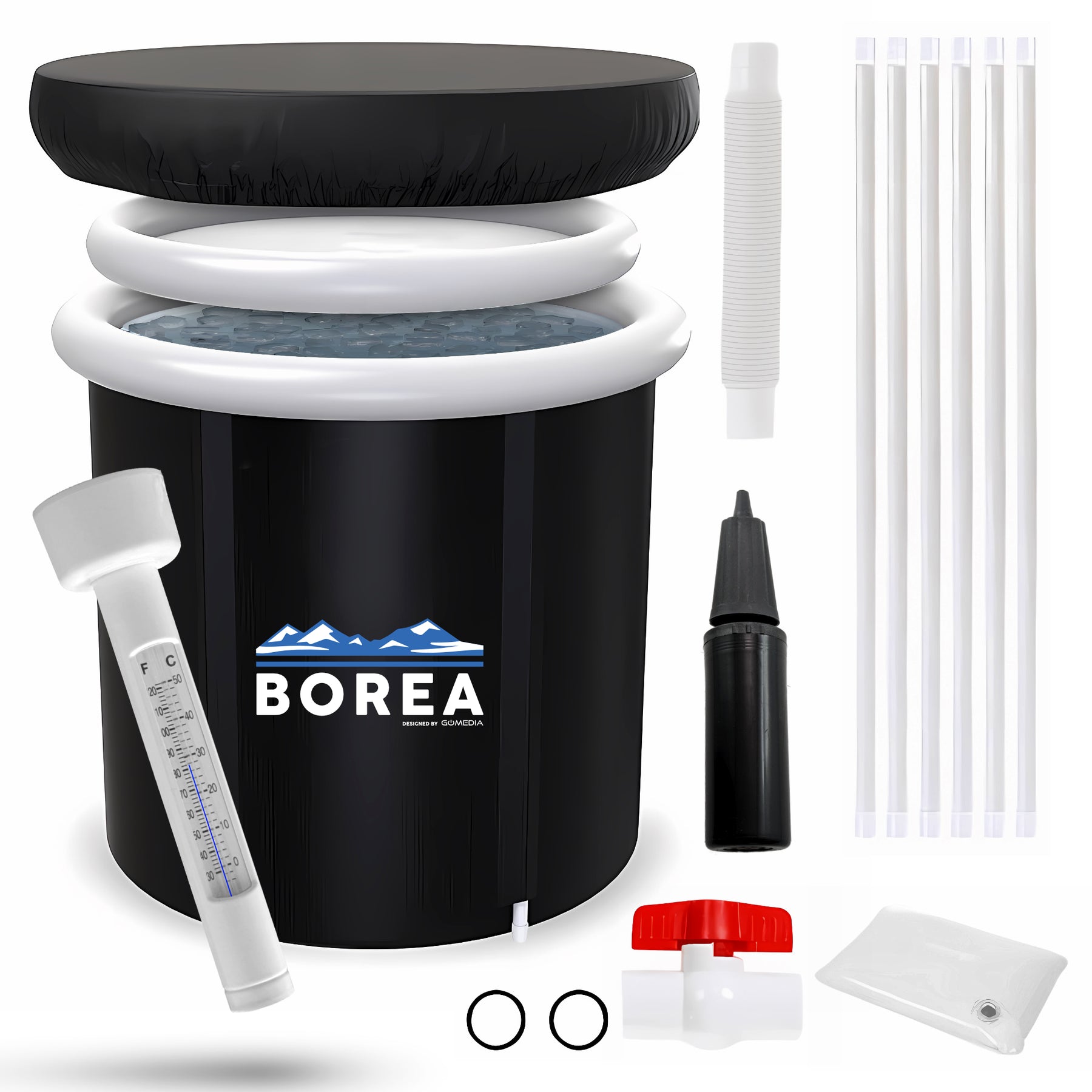 Ledo vonios komplektacija – termometras, pompa, žarna, tarpinės ir vožtuvas viename rinkinyje.