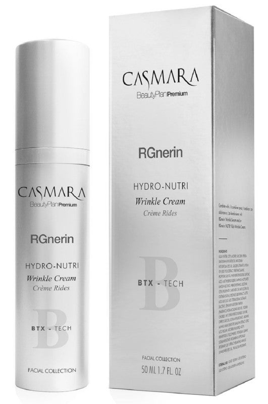 RGnerin Hydro - Nutri Wrinkle Cream , nuo raukšlių – Casmara drėkinamasis, maitinamasis veido odos kremas sukurtas kasdieniam komfortui ir odos išvaizdos gerinimui. Padeda drėkina, maitina ir stangrina. Formulė praturtinta aktyviaisiais komponentais, kurie palaiko odos elastingumą ir glotnumą. Naudojimas: tepti ant nuvalytos veido ir kaklo odos ryte/vakare.